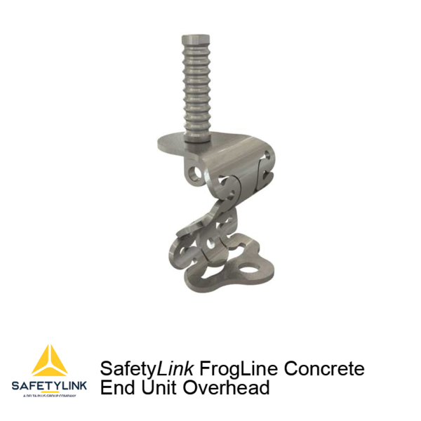A height safety system anchor point designed to be mounted into concrete as part of a horizontal lifeline system, as end anchor attachment points for the cable to start and terminate at.