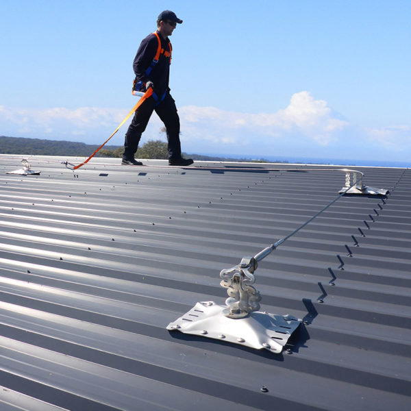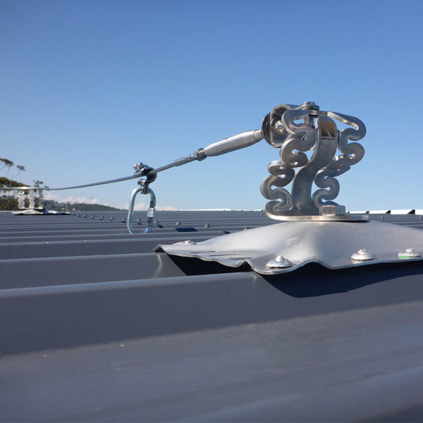 An horizontal lifeline system designed to be mounted on the surface of a metal roof profile. Fitted where access to the underside of the roof structure is difficult to access.  End anchor designed to be mounted on the surface of a metal roof profile as attachment points for the cable to start and terminate at.