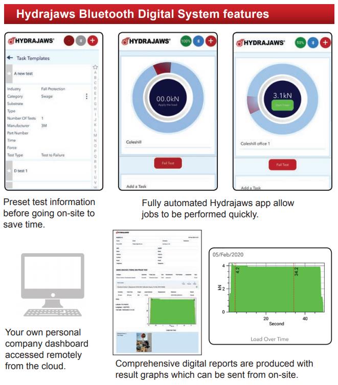 The Hydrajaws Bluetooth Digital system allows on-site pull tests to be automatically recorded and compiled into a digital report using the Hydrajaws Bluetooth Digital App on a mobile phone or tablet device. These reports can be sent directly to clients or managers and are stored in the cloud to be accessed remotely anywhere on a browser in a users own company dashboard.