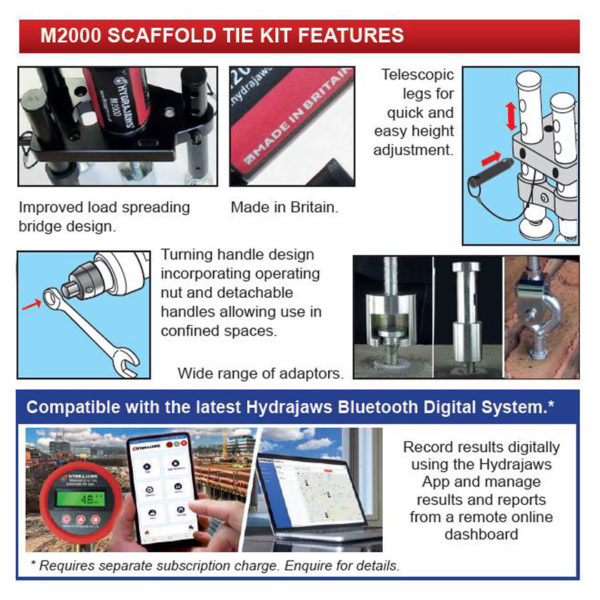 The Hydrajaws Scaffold Tie Tester Kit will test all types of anchor most commonly used for anchoring scaffold ties up to a maximum tensile load of 25kN. Adaptors include a standard Bolt Test Adaptor, M16 Threaded Stud Adaptor and M12 Ringbolt Adaptor Clevis which means a wide range of fixings can be tested. The M2000 Scaffold Anchor Pull Test kit is easy to use and light to transport.